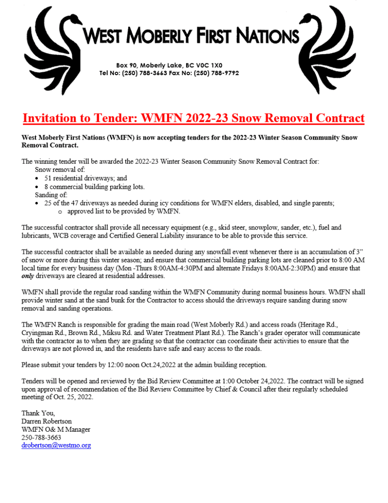 WMFN 2022-23 Snow Removal Contract Invitation to Tender – October 17, 2022